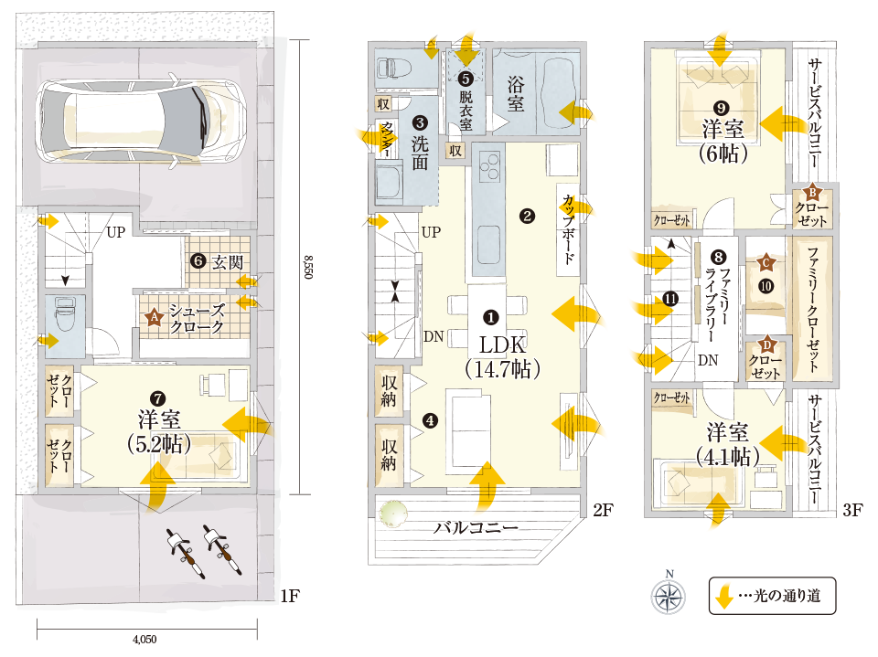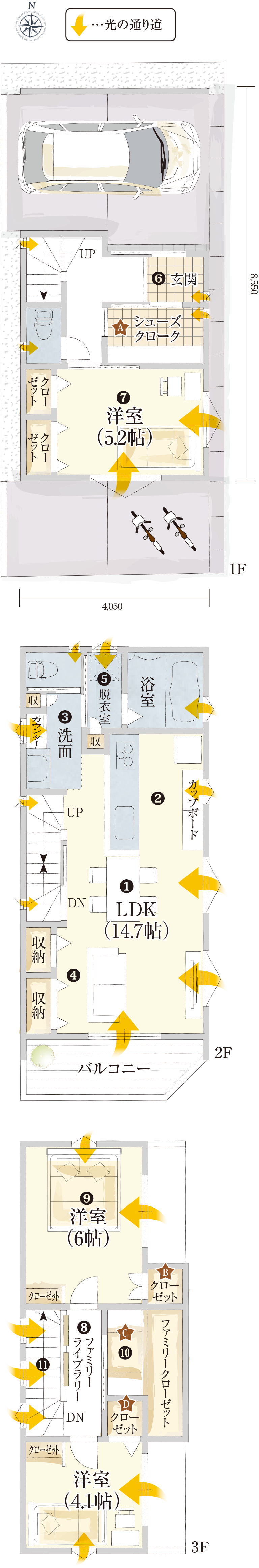 ❿3階居室に2部屋に挟まれる形で設けられた、家族が共用で使えるファミリークローゼットを完備。