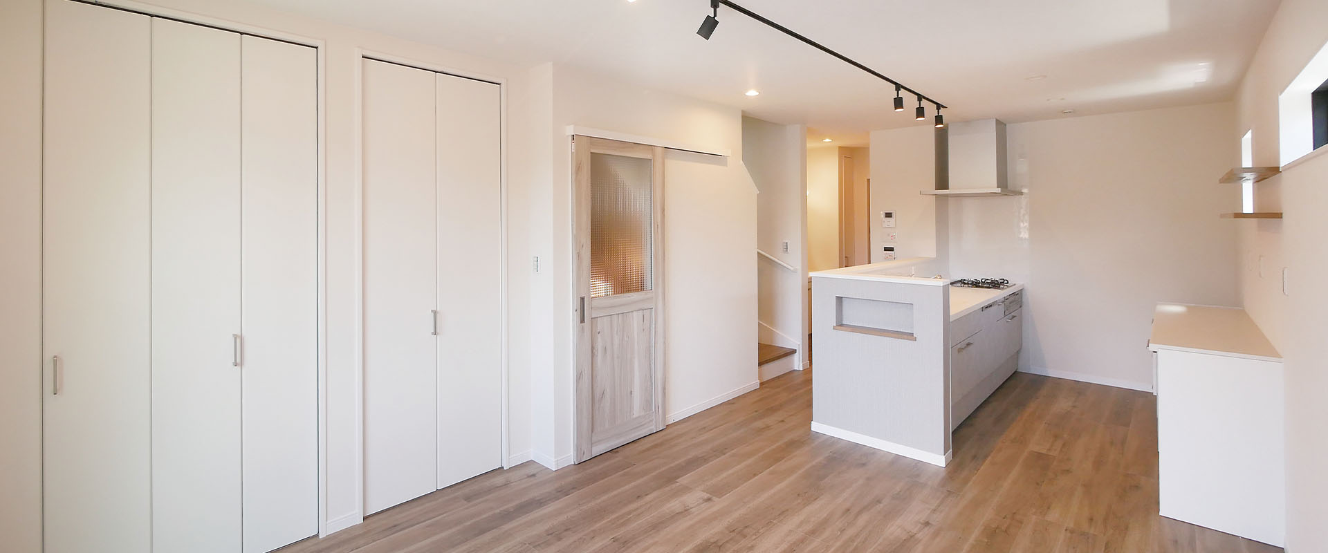 ❷奥行きのあるバルコニーに面したリビング部分を中心に、南向きの採光がLDK全体を照らします。キッチンからはLDKに加えて洗面室まで見渡せ、狭小であるメリットを活かしたLDKを実現。
