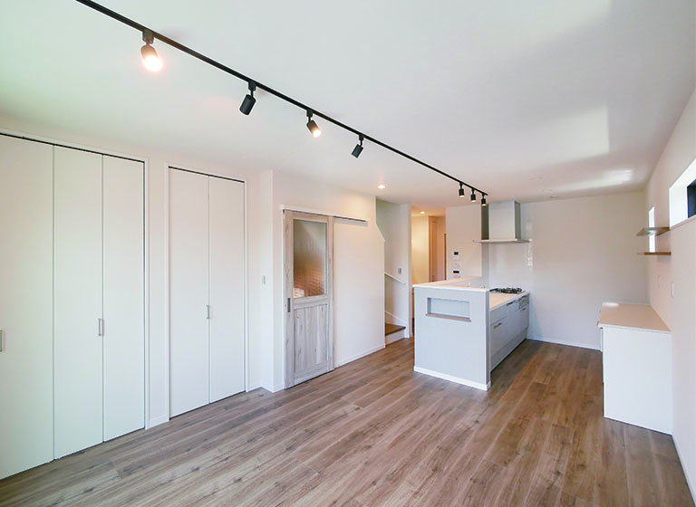 ❶木目とアイボリーを中心とした、かわいらしいLDK。リビング・ダイニングそれぞれを照らすために、おしゃれなダクトレールとスポットライトを設置。サッシとレールのダークグレーが空間を引き締めます。