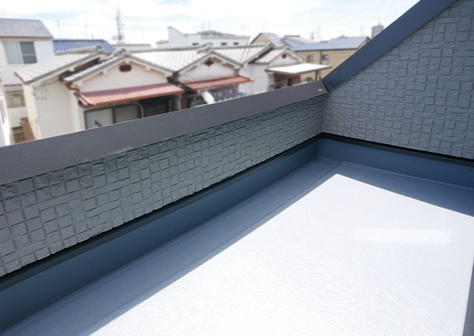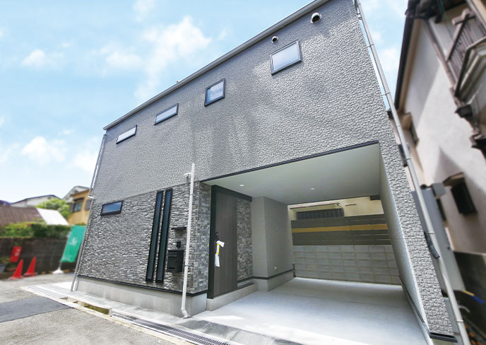間口の広い角地で、視認性が高いので、1階部分と2階部分を、細かいタイル調の柄違いで外壁を貼り分けながらも、モダンなグレー系で統一。各所のスクエア窓とサッシ色が良いアクセントに。