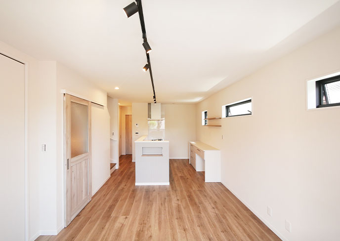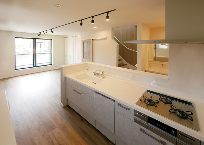 ❷奥行きのあるバルコニーに面したリビング部分を中心に、南向きの採光がLDK全体を照らします。キッチンからはLDKに加えて洗面室まで見渡せ、狭小であるメリットを活かしたLDKを実現。