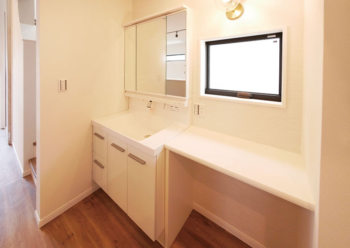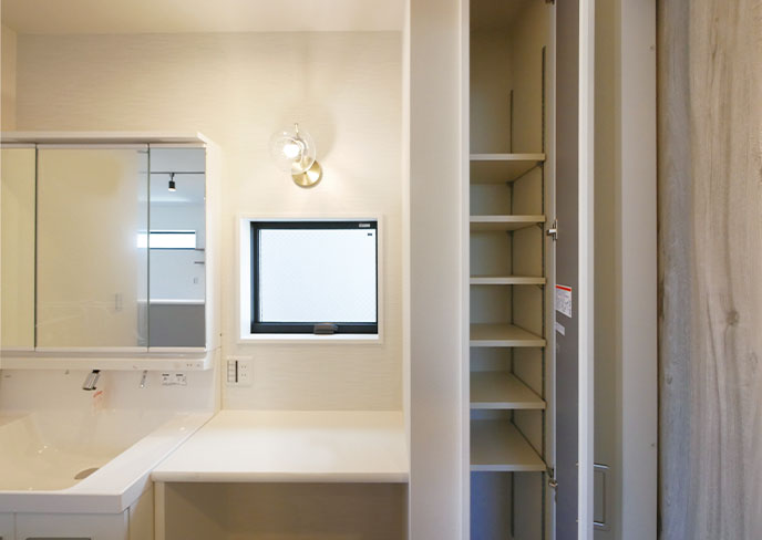 洗面室にシステムドレッサー、メイクカウンター横の僅かな隙間にもリネン収納を設けました。