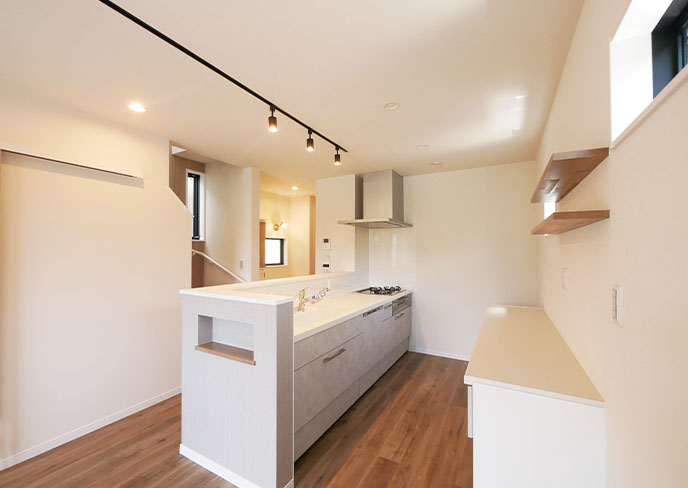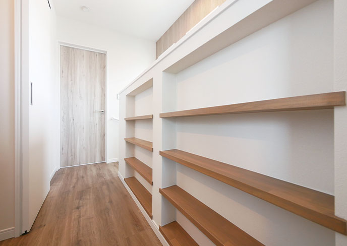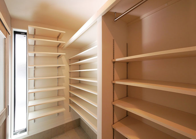 限られたスペースなので可動棚等を活用し“使える収納”を家の各所に盛り込みました。