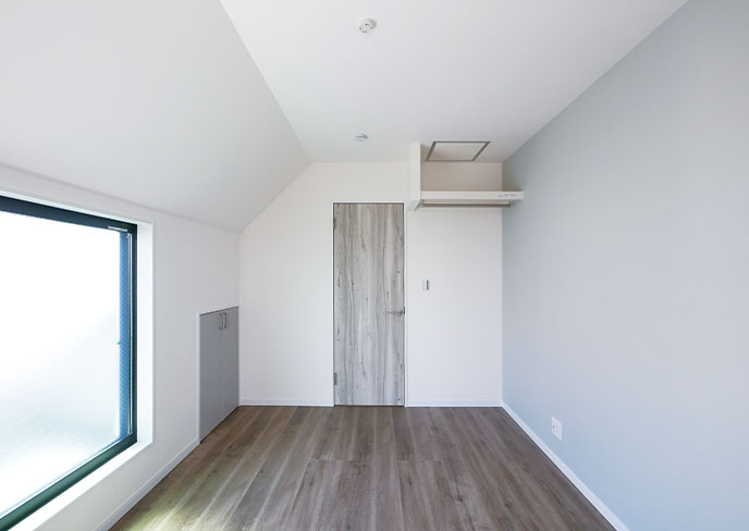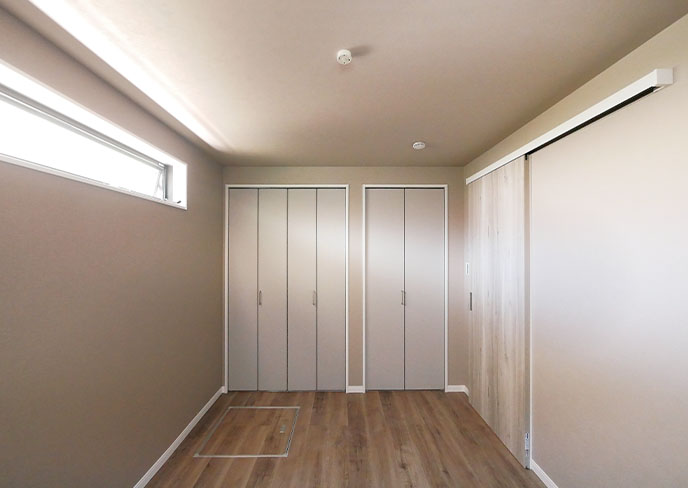 ❼1階の洋室は道路に面していることもあり、上部スリット窓を採用。プライバシーに配慮しました。