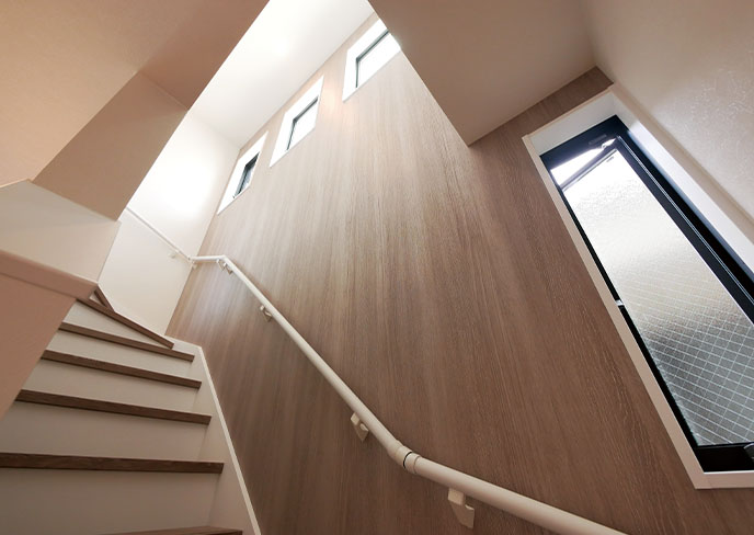 ⓫3階ホールと階段は、3連窓で明るく照らします。キッチンから見える面は、木目調の壁紙で貼り分けました。