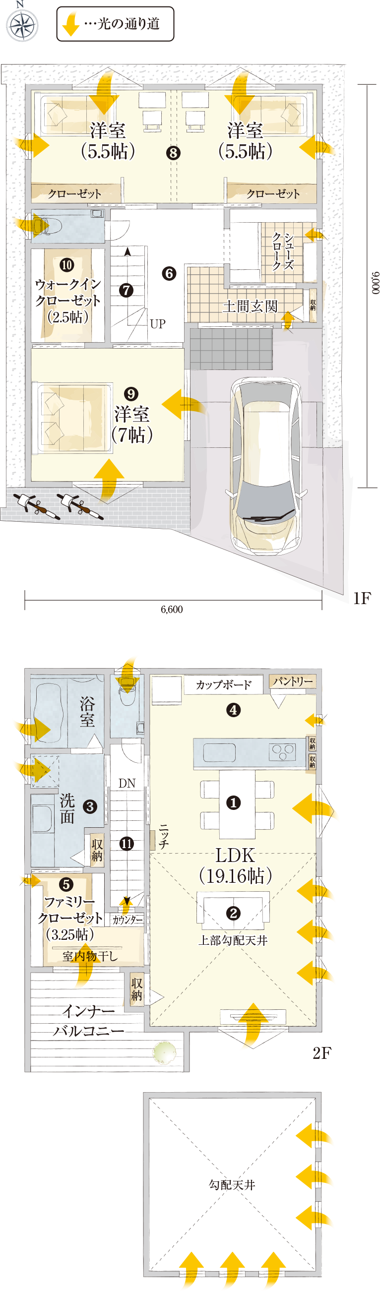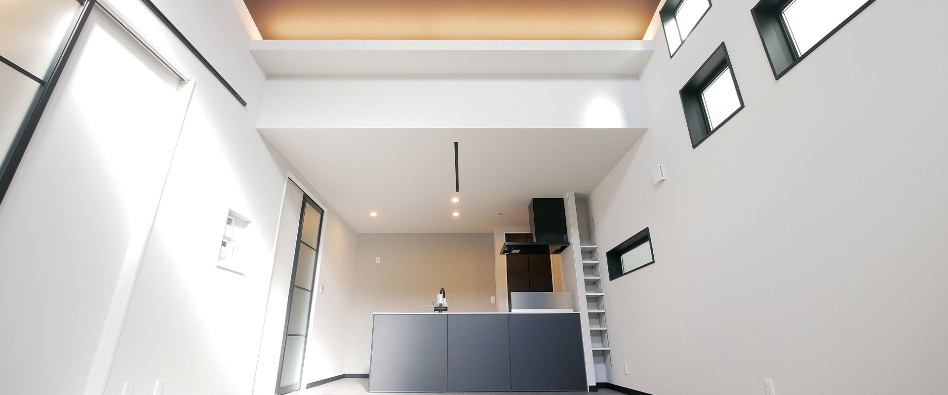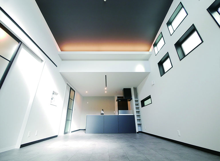 ❷リビングは開放的な勾配天井。計10枚の窓から採光が降りそそぎます。寛ぎの空間がスッキリと片付くようにリビング収納も完備。各種リモコンはニッチ内に収め、無駄な出っ張りのないLDKを実現。
