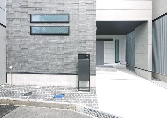 セミビルトインガレージ部分のエクステリアはおとなしくラインのみの装飾。主寝室前は外壁に合わせて、グレーのスクエアタイルを並べました。駐車の邪魔にならない道路沿いにインターホンポストを設置。