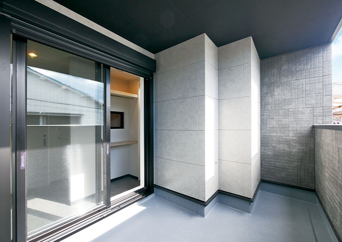 ファミリークローゼットと直結する2階バルコニーは全面屋根付きのインナーバルコニーで急な雨の時も安心。奥行きのあるゆったり空間には南向きの陽光がたっぷりと降りそそぎます。