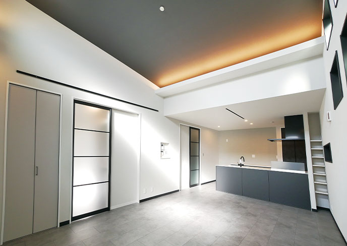 勾配天井と10連窓がもたらす開放感あふれるリビングを中心に、光と照明が織りなす上質な暮らしをデザインしました。自然光がやわらかく降り注ぐ昼間は、家族の笑顔を明るく包み込み、夜には照明がそれぞれの時間を優しく演出。ダウンライトや間接照明、スポットライトなどを効果的に配置することで、空間ごとに異なる表情を生み出します。