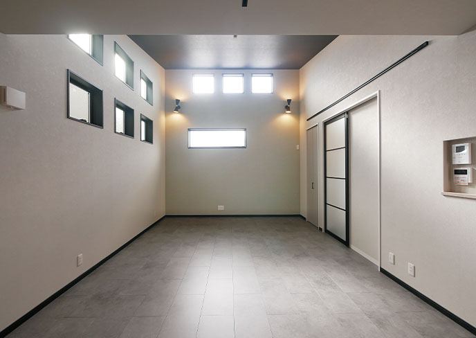 ❷リビングは開放的な勾配天井。計10枚の窓から採光が降りそそぎます。寛ぎの空間がスッキリと片付くようにリビング収納も完備。各種リモコンはニッチ内に収め、無駄な出っ張りのないLDKを実現。