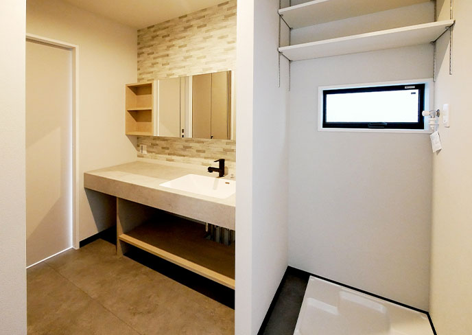 ❸洗面室は大人2人が並べるワイドなオリジナルドレッサー、洗濯機と洗面収納が並ぶ広々サイズを確保。ランドリールームとしてもスムーズに使えます。洗濯機上部にも可動棚を設けました。