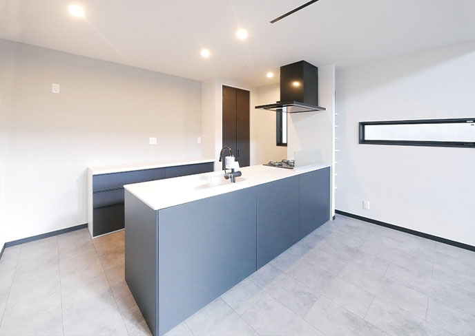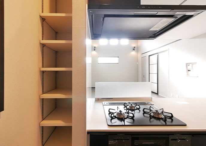キッチンすぐ横にはリビング側同様に可動棚を設置。コンロ横の隠せる収納で効率と美観を両立します。