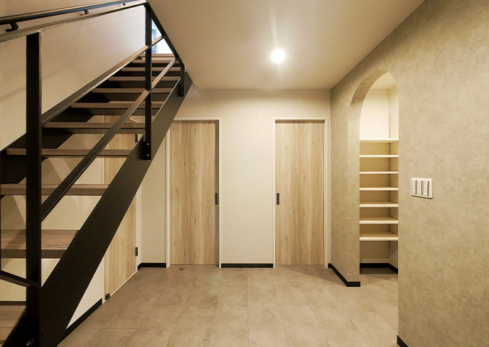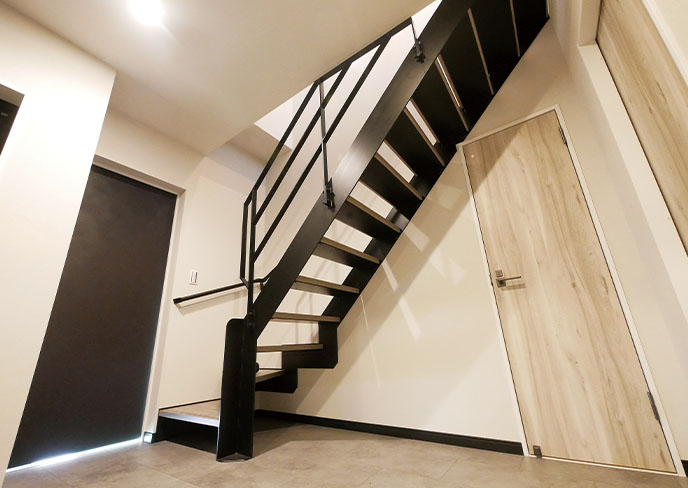 スケルトン階段を採用し、ゆったりとした玄関ホールをさらに開放的に。おしゃれなアイアンの手摺りを採用しました。