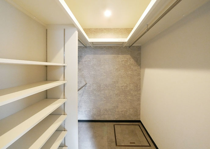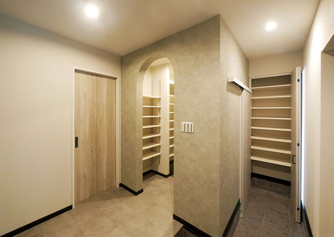 玄関はシューズクロークを通る家族用と、お客様用の2WAYを採用。それとは別に大容量シューズボックスも完備。