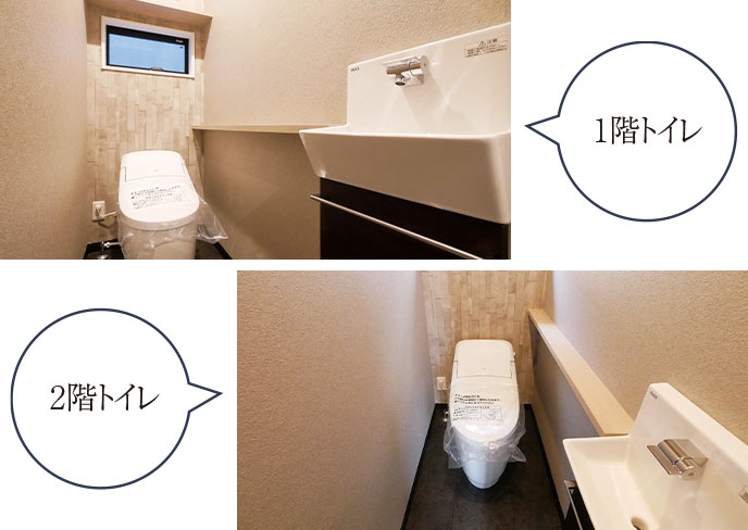 1・2階ともにタンクレスにミニカウンターと手洗いと共通仕様のトイレを設置。