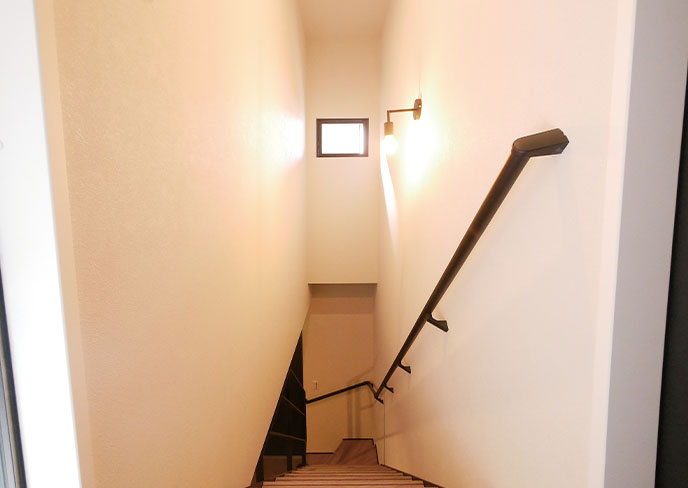 ⓫階段の吹抜け部分にはスケルトン階段に合わせたおしゃれな照明を採用。サッシの色とも相性抜群。