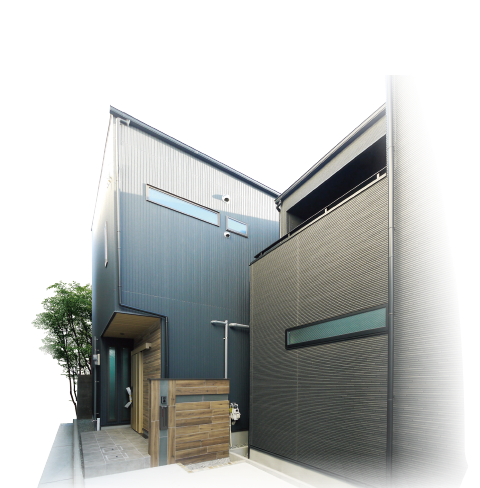 専用通路の奥、外観は隣家に隠れるので、ほとんどをシンプルな縦目の外壁とし、唯一見える玄関回りを木目調で彩りました。玄関ドア横の縦型スリット窓も合わさり、我が家の個性を発揮。
