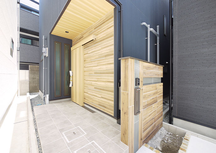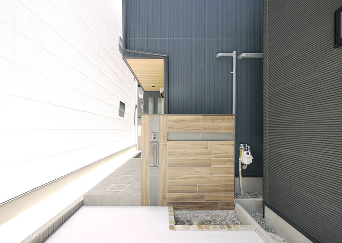 専用通路の奥、外観は隣家に隠れるので、ほとんどをシンプルな縦目の外壁とし、唯一見える玄関回りを木目調で彩りました。玄関ドア横の縦型スリット窓も合わさり、我が家の個性を発揮。