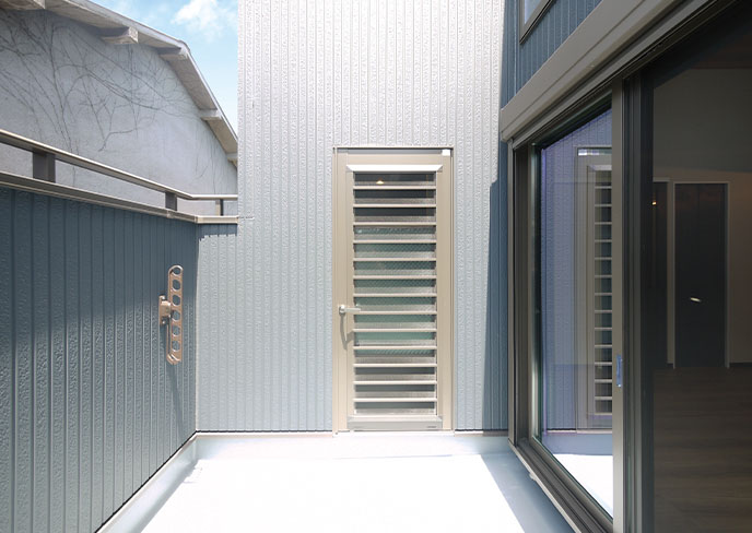 リビングに面するバルコニーは近隣との相互プライベシーを考慮して高手摺を採用しました。洗濯物をそのまま干せるようランドリールームから直接出ることができ、リビングにも南側の採光をもたらします。