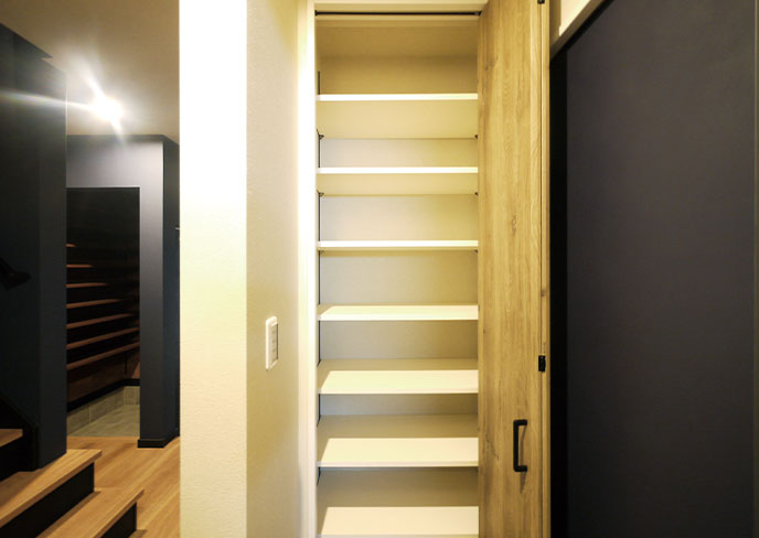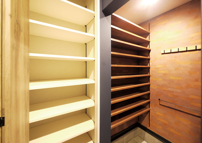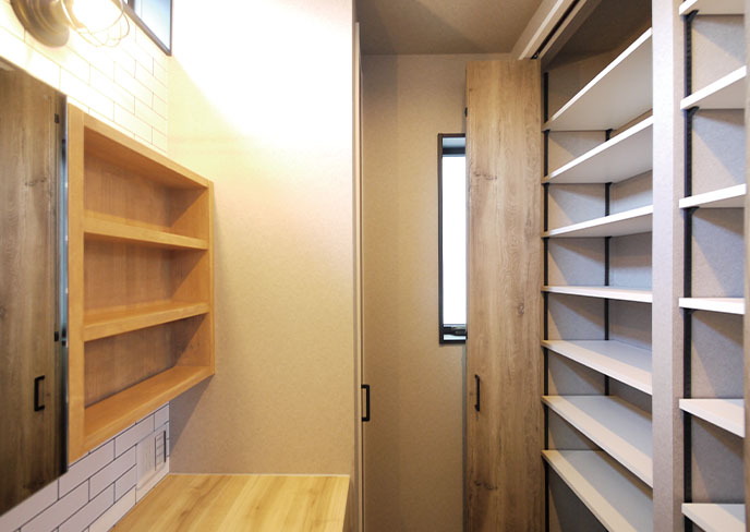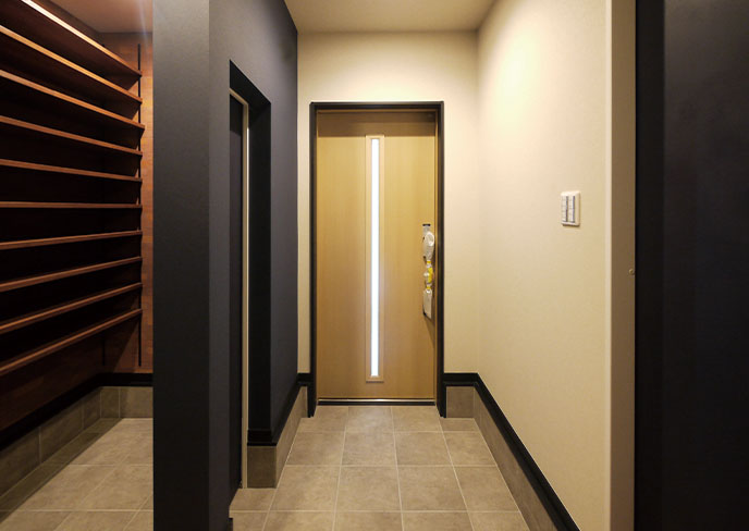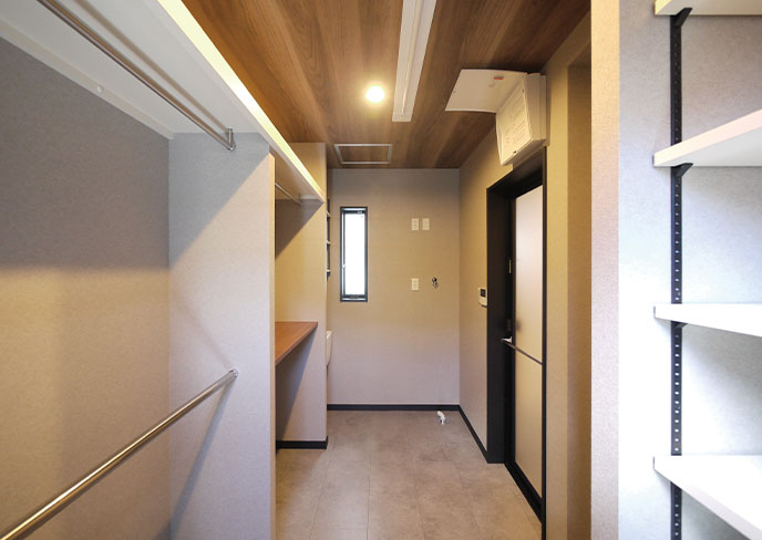 ❼玄関は家族が通るウォークスルーのシューズクロークを完備。物が多くても玄関はいつもスッキリ。