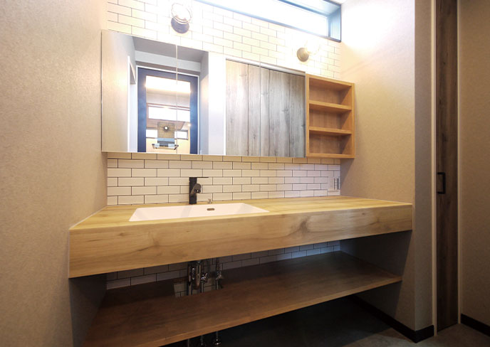 ❻独立した洗面室には大人2人が並べるワイドなオリジナルドレッサーを設置。