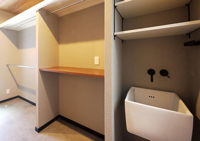 ランドリールームにはスロップシンクを設け、靴や汚れの酷い物をジャブジャブ洗えます。