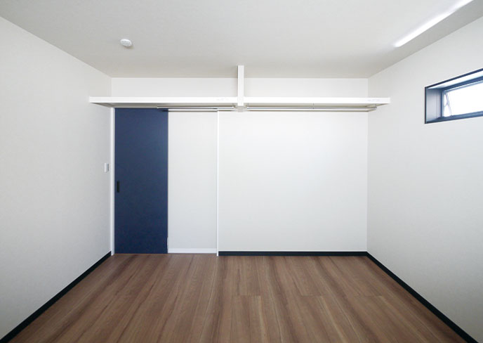 ❽1階居室8帖にはワイドなオープンクローゼットを設置。上部の収納棚は1面全てに跨る3.6m。