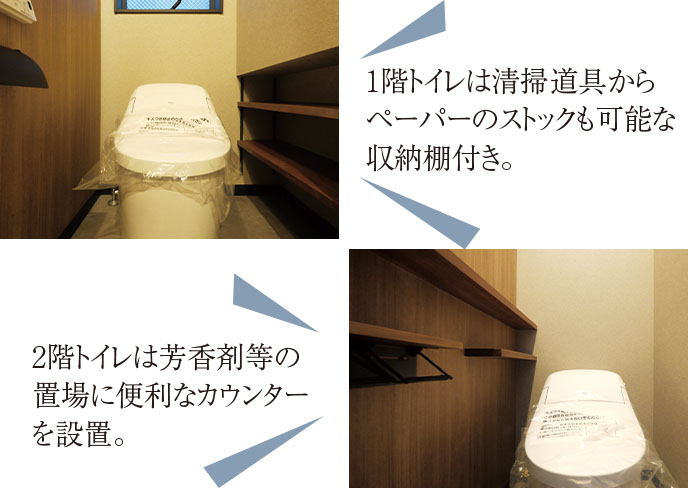 1階トイレは階段下を活用した収納棚付き。2階トイレはカウンター付きで便利。また、出てすぐの洗面室には収納も豊富。