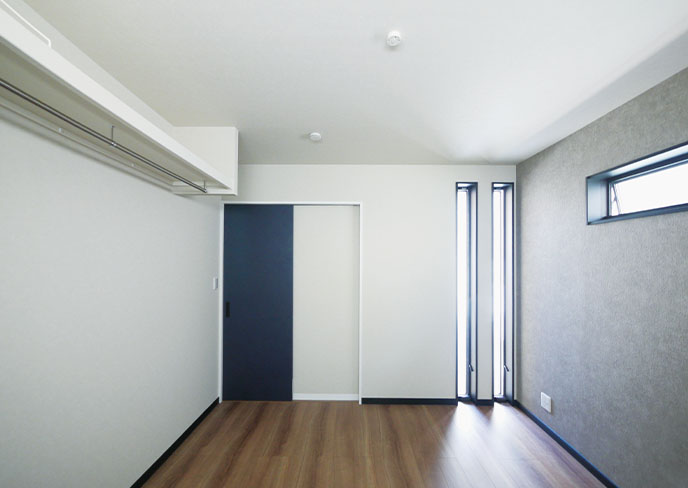 ❿1階の洋室は横型・縦型のスリット窓を使い分け。1面はクロスを貼り分けました。