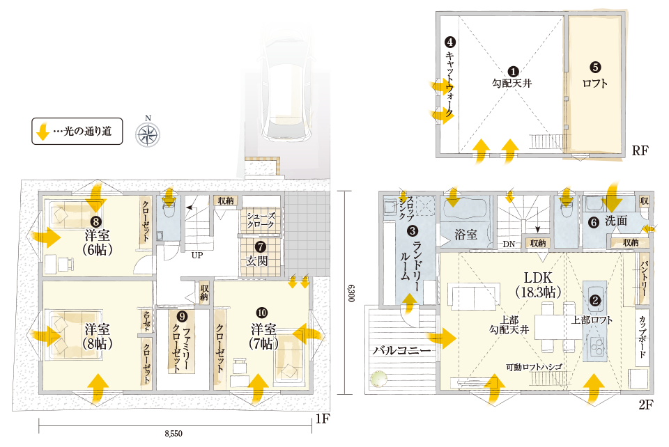 ❶隣家に囲まれていますが、バルコニーからの陽射しが勾配天井のリビングを通り、LDK全体に降りそそぎます。キッチンやロフトのダークグレーのアイアン手摺が木目の差し色に相性ピッタリ。