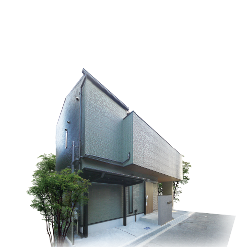 すっぽり覆われるビルトインガレージに加えて駐輪スペースにも屋根を設置。インターホンウォール横にはシンボルツリーを植樹出来るよう土部分を確保。照明もあり雰囲気のあるエントランスを演出します。