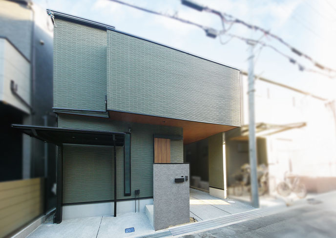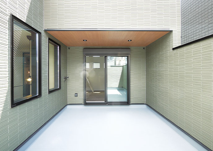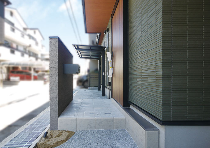 貫禄の間口を誇る外観はアースカラーのグリーン系を採用。木目調のガレージ天井や玄関ドアはともに相性が良く、悪目立ちせずに個性を主張。目隠しも兼ねて玄関ドア前にインターホンウォールを立てました。