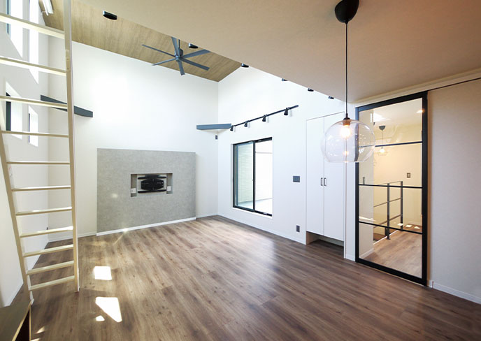開放的なリビングの床と勾配天井の木目調の柄が、化粧貼り、シーリングファン、ダクトレール&スポットライトのダークグレイと相性バッチリ。リビング収納の下部はロボット掃除機用に開放しています。