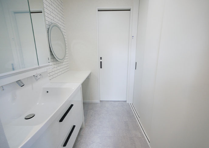 ❷家族の身支度がスムーズに行える、独立した洗面室には、洗面ドレッサーとメイクカウンターが横並び。背面には大型のリネン庫を備え、洗面・洗濯に使う物を使う場所で全てしまえる理想の収納を実現しました。