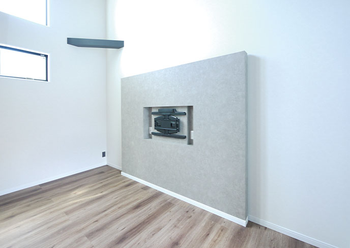 ❺リビングのテレビ設置予定場所には、ふかし壁を設けスッキリとしたAVライフを実現。
