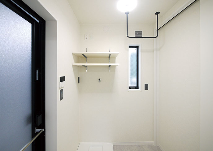 ❻脱衣所を兼ねたランドリールームには、部屋干し様にアイアンのおしゃれな物干しを設けました。