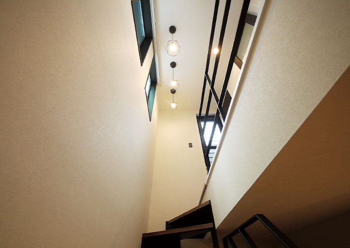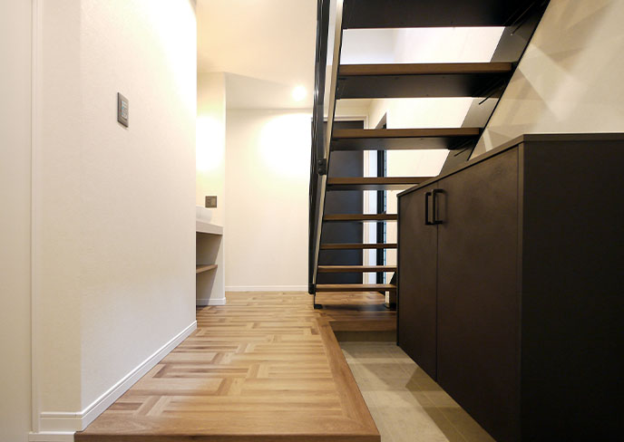 ❼玄関の框間口を広く設け、ストリップ階段を採用することで、サイズ以上の開放感が感じることができます。