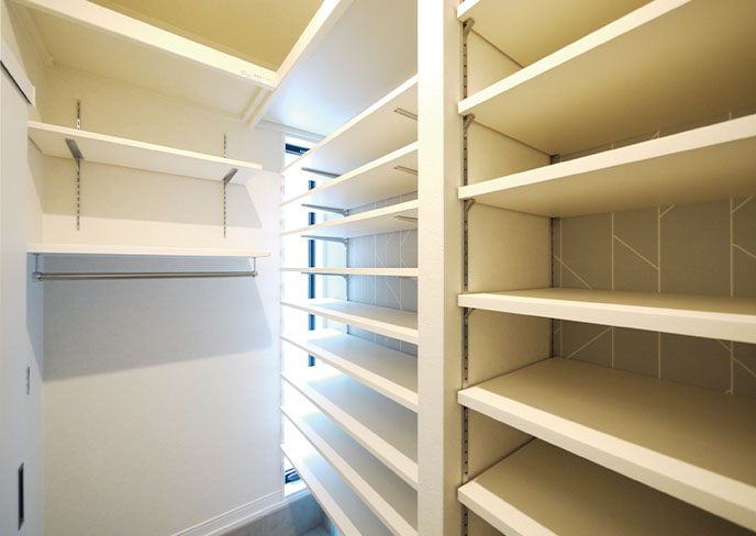 ❼シューズクロークには靴以外も収納できるよう、ハンガーパイプや可動棚で収納力を確保。