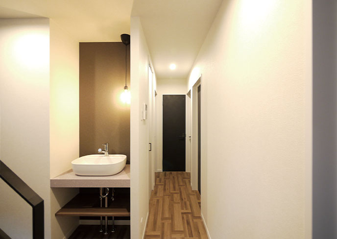 玄関近くに配置するのに相応しい、雰囲気のあるおしゃれな“ただいま洗面”を採用。すぐ横には収納も完備。