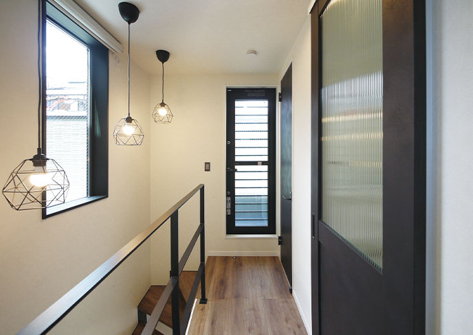 ⓫スリット階段にはバルコニーに面した2連窓から陽射しが降りそそぎ、玄関ホールまで照らします。