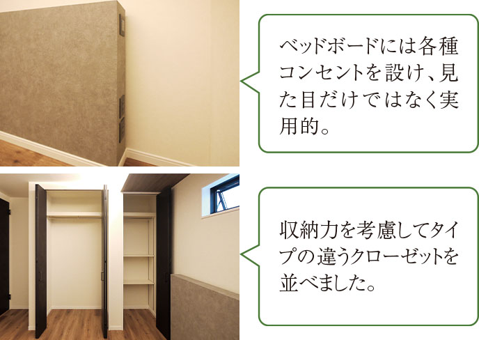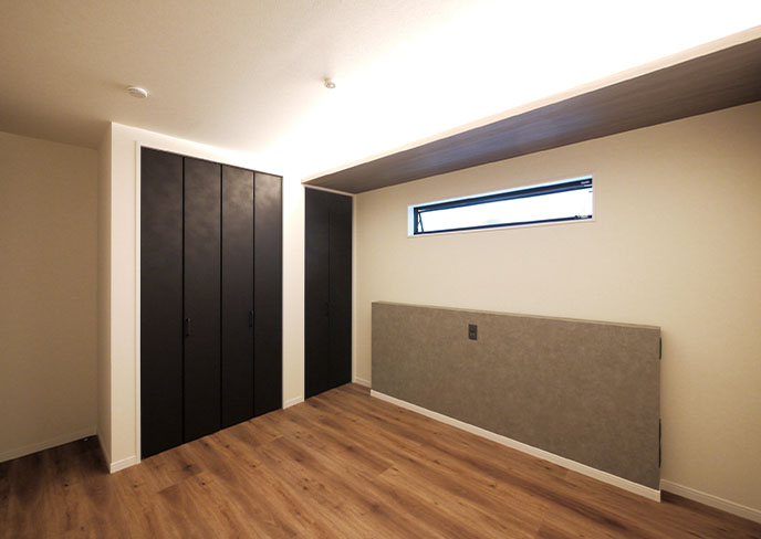 ❿主寝室は間接照明にベッドボードと雰囲気のあるホテルライクなベッドルームを目指しました。