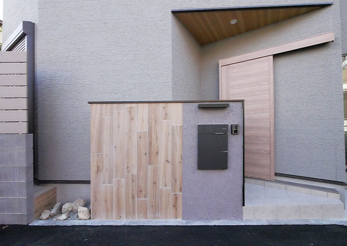 シンプルなアースブラウンの外壁に、玄関ドアや軒下など、各所に見える木目が栄える、広い間口を誇る貫禄の外観。玄関前にはプライバシー性を高める、おしゃれなインターホンウォールを設置。
