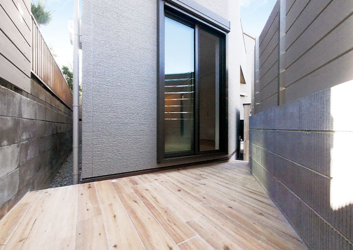 リビング前には個性的な敷地形状を活かした、水栓完備のテラスを設けました。少し高めにフェンスを設けることで、リビングも含めてプライバシー性を確保。物干しとしても、屋外リビングとしてもご利用頂けます。