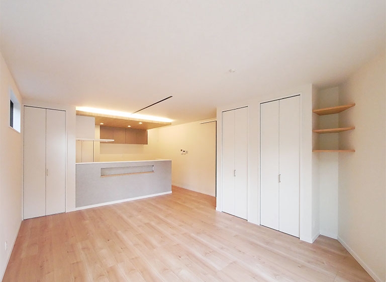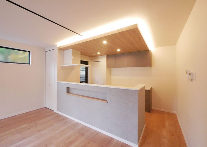 ❶キッチンは下がり天井にして間接照明・ダウンライトを設置し、上質な空間を演出。キッチン・リビングとは別にダイニング収納も完備。L・D・Kそれぞれに独立した収納を設け、家族全員が留まりたい空間を目指します。