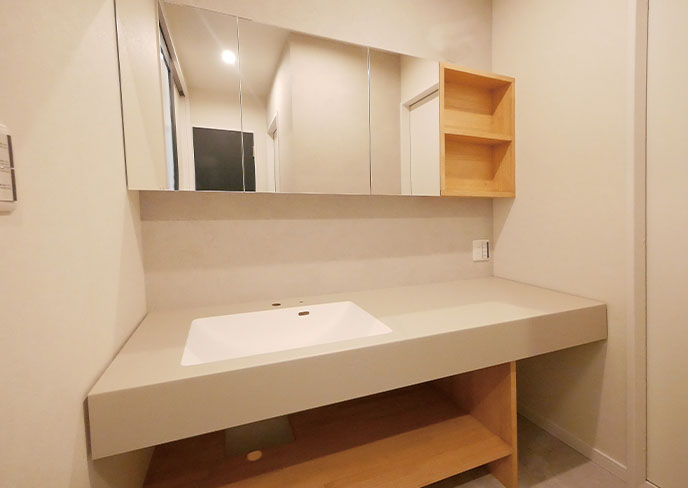 ❷「ただいま」の手洗いがスムーズに行えるよう、玄関からすぐの場所に洗面室を設置。脱衣室とは分離することで、家族が入浴中でも遠慮なく寝支度が行えます。大人2人が並べるワイドなドレッサーを完備。