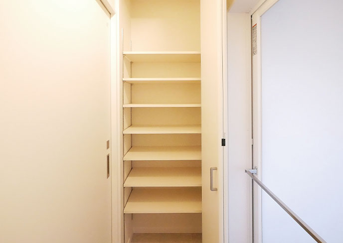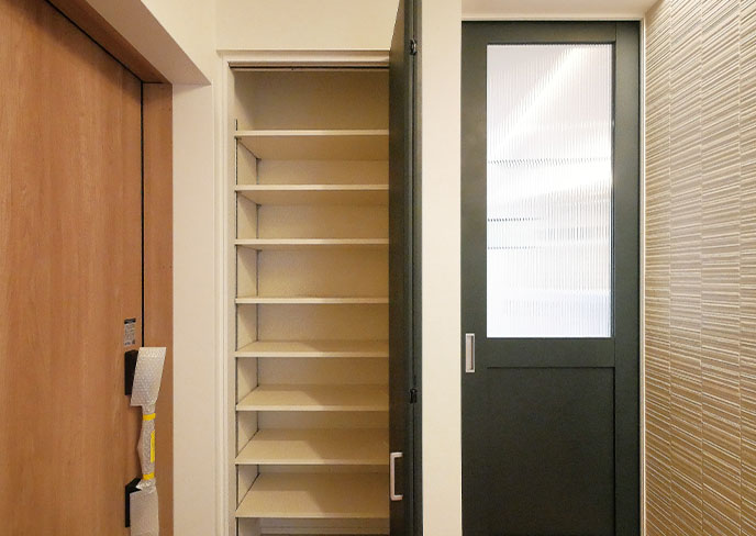 玄関横には可動棚で使い易い、シューズクローゼットを完備。他と合わせてダークグリーンの建具で統一。