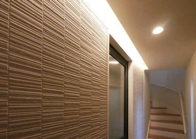❼玄関から入ってすぐ、ホールの壁はテクスチャのある壁に間接照明を設置。上質な空間がお出迎え。