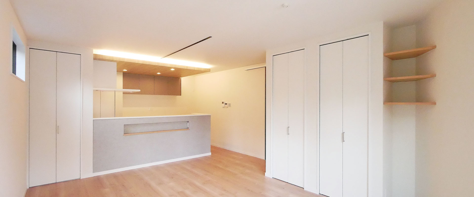 ❸暮らし始めて不足に気付く、リビング収納も充実。飾り棚で寛ぎのリビングを彩ります。