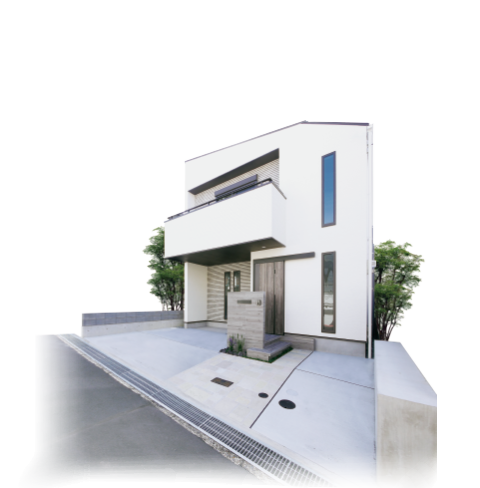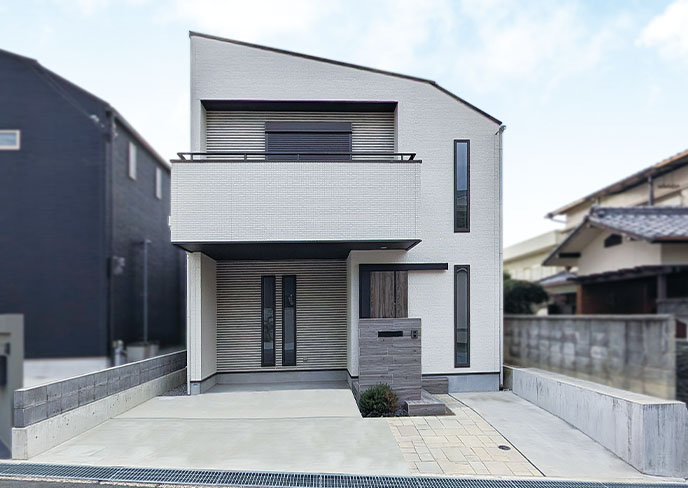 貫禄の間口を誇る外観はシンプルな白でありながらバルコニー部分とそれ以外をテクスチャで変化を付け、各所のスリット窓も相まって、エクステリアも含めやさしい色合いながらもスタイリッシュにまとまりました。