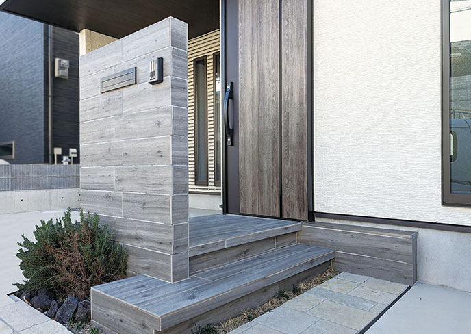 玄関ドア前には室内をのぞき込まれないようプライバシーに配慮したインターホンウォールを設置。ポーチを含めて木目で彩りました。ポーチから続くアプローチタイルとワンポイントの植栽が栄えます。